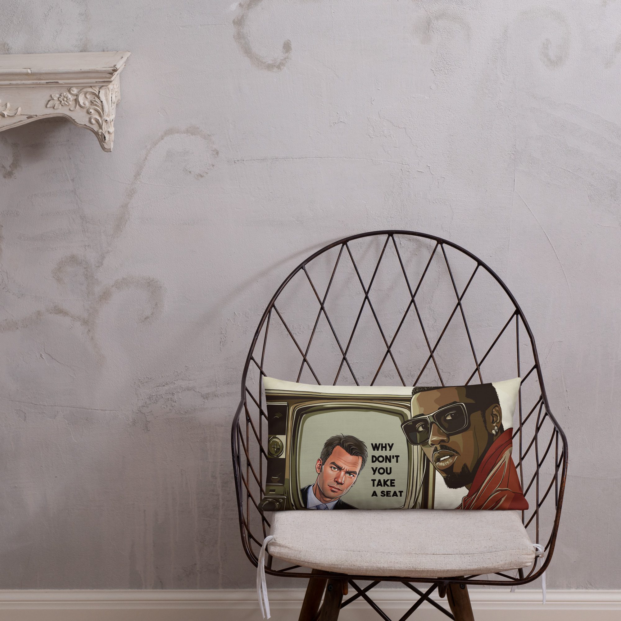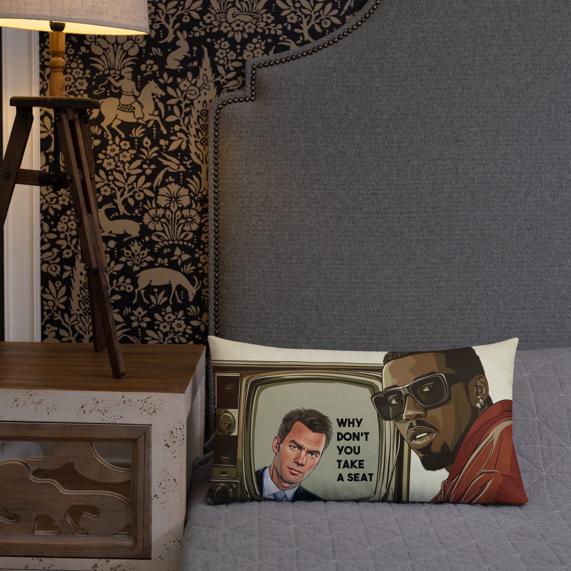 Ever wondered what would happen if hip-hop met hard-hitting investigative journalism? Well, wonder no more—because “To Catch a Diddy” is here to shake up your couch, gaming setup, or questionable life choices. This GTA-style masterpiece features a suspiciously familiar rapper in shades getting caught up in a classic “Why don’t you take a seat?” moment. With a vintage TV screen throwing some serious side-eye, this pillow is basically the perfect conversation starter (or ender, depending on how guilty your guests look).